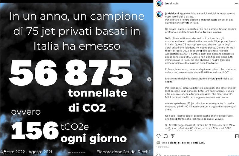 Che il cambiamento climatico sia anche causato dalle forti disuguaglianze esistenti in ogni società non è certo una novità. Ci sono settori dove questo è comunque particolarmente evidente, se ci riflettiamo un attimo. Prendiamo ad esempio i jet privati, di cui si discute molto in questi giorni perché diversi politici in campagna elettorale, a cominciare dal partito Unione Popolare, poi Verdi Sinistra, poi anche Beppe Grillo, hanno spinto a riflettere sulla possibilità di vietare, abolire, limitare l’utilizzo dei jet privati. Anche senza arrivare a esempi estremi di miliardari